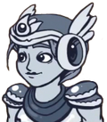 Raynel is a young female Keen Gnome with blue eyes and light pink hair. She wears golden plate armor with brown trims on the top and a brown belt with a silver and blue buckle. Her plate shoulder pads are often referred to look like pastries. She wears golden gauntlets and boots that have brown knee caps. Underneath her armor, she wears a loose fitting, long sleeve dark brown shirt, a dark brown skirt and a white cape that has a brown trim along the bottom. She wears a plate helmet that is brown with a golden trip, golden ear covers, white wing-like accessories and a white emblem on the front with a blue gem.