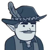 Buford is an extremely large elf, towering over the rest of his compatriots, he has a hand removed and replaced with his Blunderbuss, which was damaged slightly and sawed off. He has short hair that is obscured by his hat, and has a long, pencil mustache. Buford wears a wide brim hat, with a leopard pelt strap that has a feather of unknown origin sticking out of it. He wears a collared shirt that is open to reveal his chest hair, but stops at an upside down star button. Over that he wears a vest.